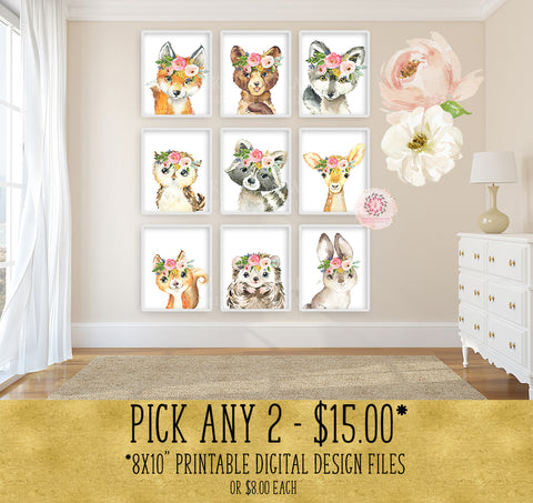 2 - Choose From 9 Boho Fox Bear Deer Bunny Wall Art Print Woodland Floral Nursery Baby Girl Room Hedgehog Wolf Squirrel Owl Raccoon Blush Floral Bohemian Watercolor Set Prints Printable Decor