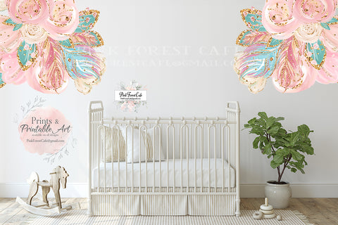 2 - 40" Feather Pink Gold Rose Peony Peonies Floral Wall Decal Sticker Flower Watercolor Decals Art Boho Decor