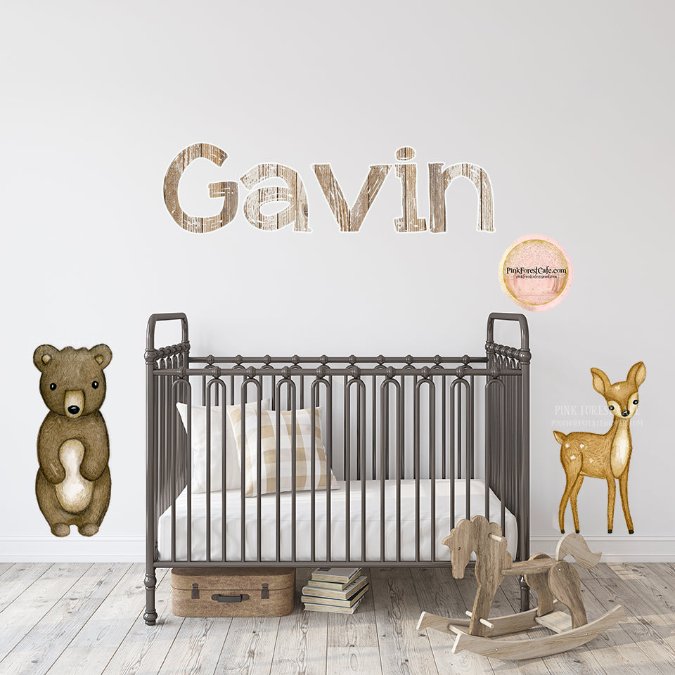 This listing is for 2 separate matte vinyl wall art decal stickers, animals only, name can be ordered separately - The bear is 20" tall and the deer is 16" tall - they are washable and can be placed and removed in order for them to be placed again - perfect for renters or for anyone that doesn't want to commit to wallpaper. Each has a 1/16" - 1/8" white border. (They are gorgeous! US shipping is included. ***Discount codes do not apply to decal orders***