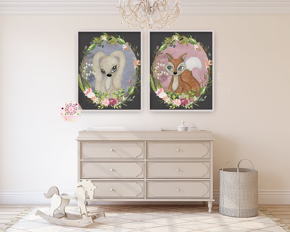 2 Boho Bunny Fox Ethereal Wall Art Print Baby Nursery Woodland Fleur Forest Room Printable Home Decor