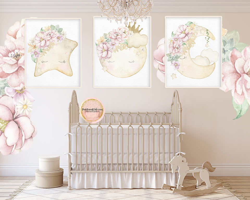 3 Boho Star Moon Lace Wall Art Print Baby Girl Blush Ethereal Nursery Room Watercolor Printable Décor by Pink Forest Café - Making your world a happier place, one wall at a time!
