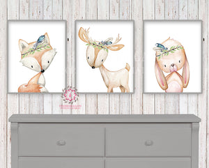 3 Deer Fox Bunny Rabbit Tribal Boy Nursery Printable Print Wall Art Woodland Feathers Boho Baby Bedroom Set Lot Prints Decor