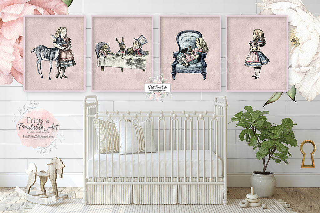 4 Alice In Wonderland Wall Art Print Vintage Dusty Mauve Nursery Baby Girl Room Printable Decor