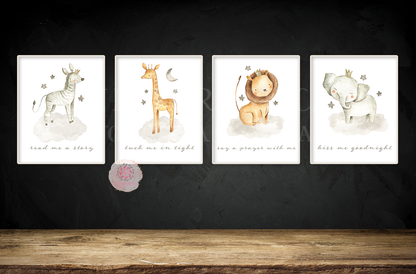 4 Safari Zoo Elephant Wall Art Print Baby Boy Nursery Giraffe Zebra Lion Kiss Me Goodnight Moon Stars Whimsical Animal Watercolor Printable Decor by Pink Forest Café - Making your world a happier place, one wall at a time!