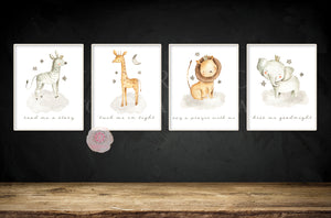4 Safari Zoo Elephant Wall Art Print Baby Boy Nursery Giraffe Zebra Lion Kiss Me Goodnight Moon Stars Whimsical Animal Watercolor Printable Decor