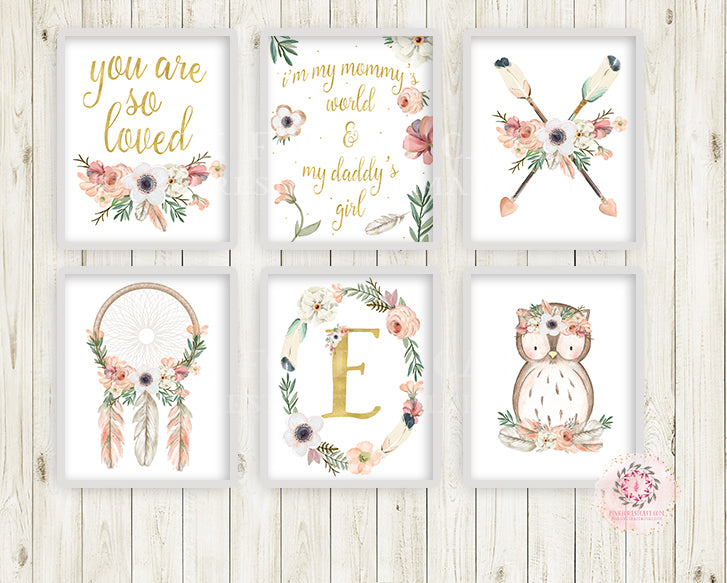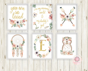 6 Boho Wall Art Print Owl Nursery Baby Girl Room Set Personalized Printable Bohemian Print Woodland Decor by Pink Forest Café - Making your world a happier place, one wall at a time!