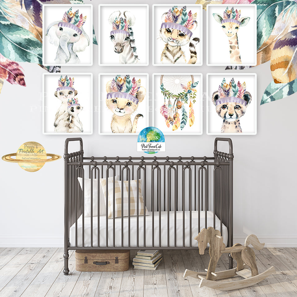 8 Headdress Feather Tribal Elephant Zoo Wall Art Print Dreamcatcher Baby Nursery Boho Whimsical Zoo Safari Animal Watercolor Printable Decor by Pink Forest Café - Making your world a happier place, one wall at a time!