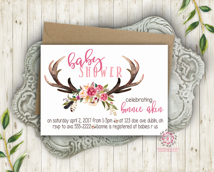 Baby Bridal Shower Birthday Party Invitation Invite Deer Antlers Wedding Save The Date Announcement Feathers Tribal Woodland Watercolor Floral Rustic Printable Art Stationery Card