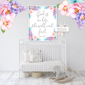 Bible Verse God Is In Her She Will Not Fall Wall Art Print Christian Scripture Bohemian Boho Purple Feather Floral Flower Nursery Baby Girl Room Printable Decor by Pink Forest Cafe - Making your world a happier place, one wall at a time!