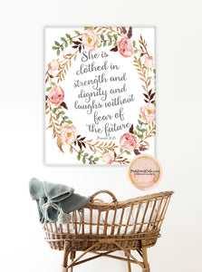 Boho Arrow Bible Verse Wall Art Print Proverbs 31:25 Woodland Bohemian Floral Nursery Baby Girl Room Printable Decor by Pink Forest Cafe - Making your world a happier place, one wall at a time!