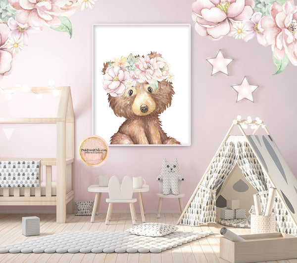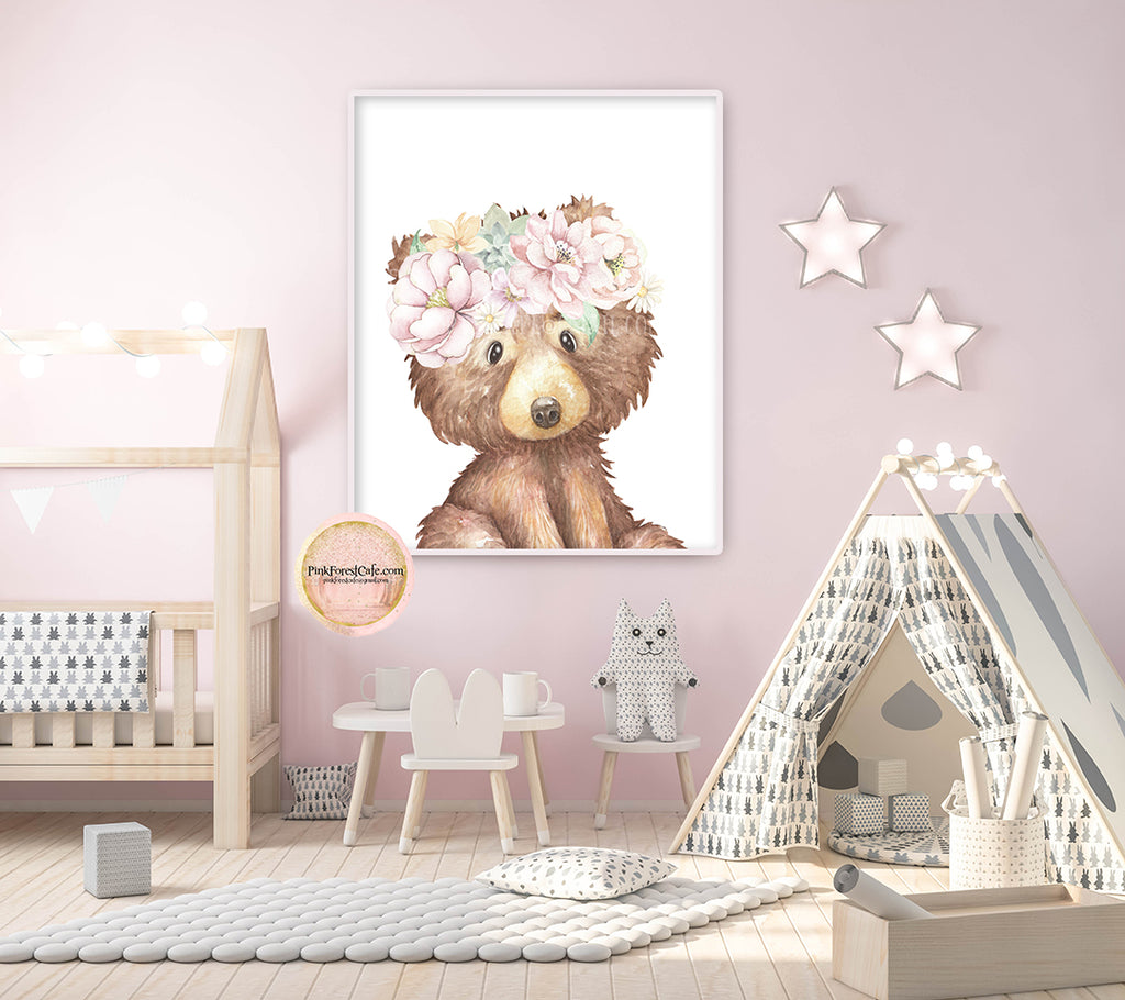 Boho Bear Blush Wall Art Print Woodland Nursery Baby Girl Room Floral Bohemian Watercolor Printable Décor from Pink Forest Café - Follow on Pinterest and Instagram - "Making your world a happier place, one wall at a time!"