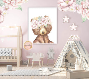 Boho Bear Blush Wall Art Print Woodland Nursery Baby Girl Room Floral Bohemian Watercolor Printable Decor