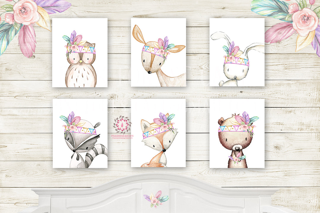 Boho Bunny Bear Deer Fox Nursery Wall Art Woodland Prints Pink Purple Mint Feather Bohemian Baby Room Raccoon Owl Home Decor Print Set Of 6