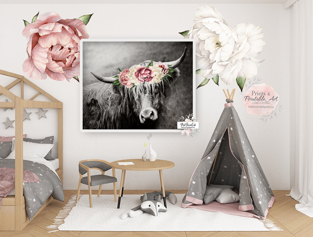 Boho Highland Cow Wall Art Print Peony Scottish Farm Blush Nursery Baby Girl Room Printable Decor