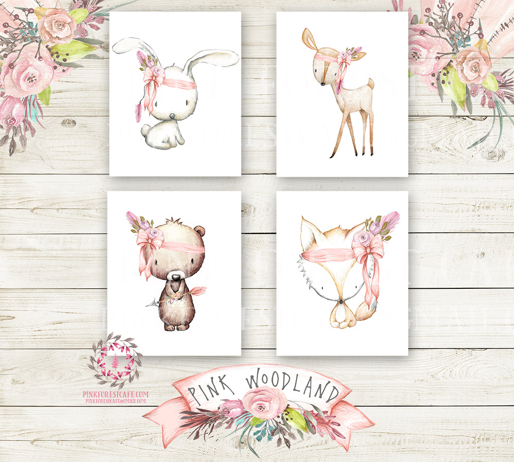 Boho Pink Fox Bunny Rabbit Deer Raccoon Teepee Wall Art Print Woodland Bohemian Floral Nursery Baby Girl Room Bear Owl Arrow Printable Set Of 4 Decor by Pink Forest Cafe
