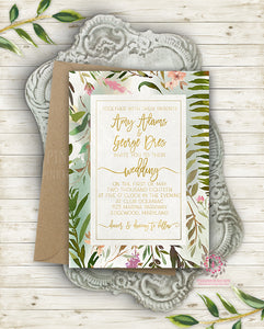 Botanical Greenery Wedding Ethereal Gold Invite Invitation Floral Bridal Shower Save The Date Watercolor Leaves Printable Announcement by Pink Forest Cafe