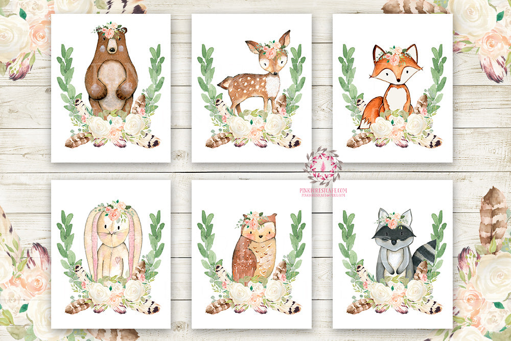 6 Bunny Bear Deer Fox Nursery Wall Art Print Set Woodland Boho Prints Bohemian Garden Blush Floral Baby Room Raccoon Owl Decor