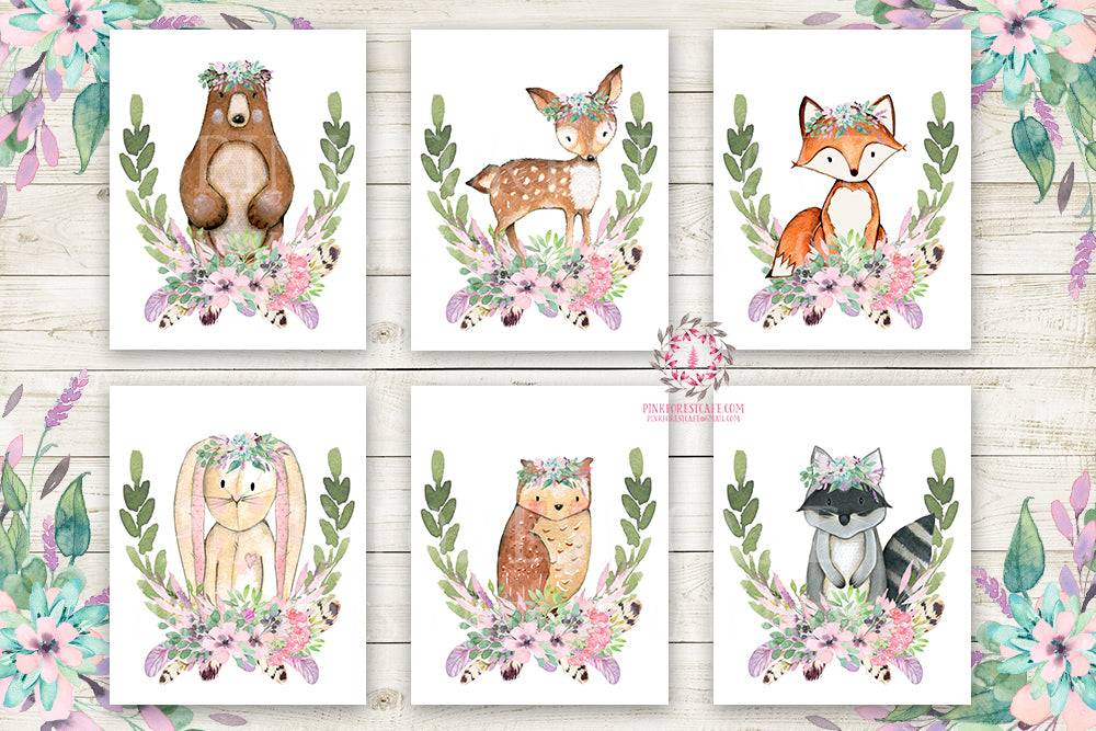 Bunny Bear Deer Fox Nursery Wall Art Woodland Boho Prints Bohemian Purple Floral Baby Room Raccoon Owl Home Decor Print Set Of 6