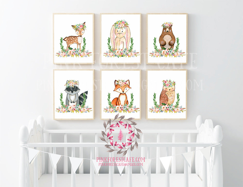 Bunny Bear Deer Fox Nursery Woodland Boho Prints Bohemian Garden Blush Floral Baby Room Raccoon Owl Wall Art Home Decor Print Set Of 6