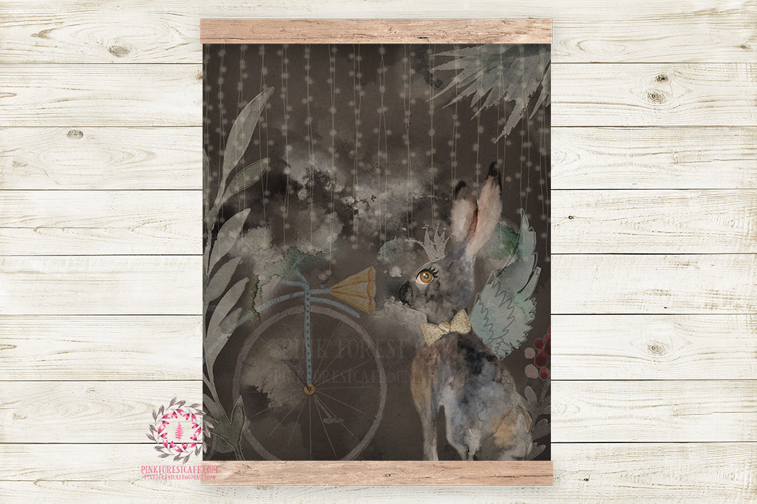 Bunny Rabbit Monochrome Nursery Wall Art Print Baby Ethereal Woodland Rustic "Robert" Bicycle Printable Watercolor Mystery Fantasy Decor