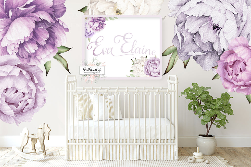 Custom Calligraphy Name Wall Art Print Baby Girl 16x20 Boho Purple Personalized Peony Watercolor Baby Nursery Decor