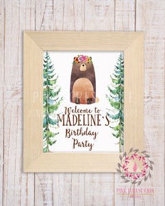 Personalized Woodland Bear Welcome to Birthday Party Baby Bridal Shower Supply Decor Printable Sign Poster Print Wall Art