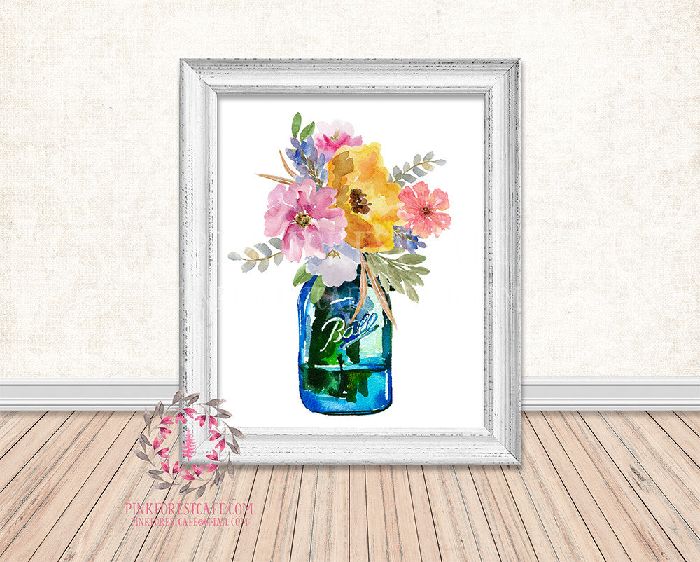 Mason Jar Watercolor Floral Boho Printable Print Wall Art Home Decor