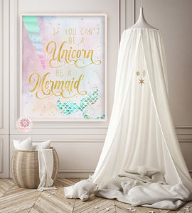 If You Can't Be A Unicorn Be A Mermaid Wall Art Print Ethereal Baby Girl Nursery Whimsical Floral Pink Gold Purple Printable Decor by Pink Forest Cafe - "Making your world a happier place, one wall at a time"