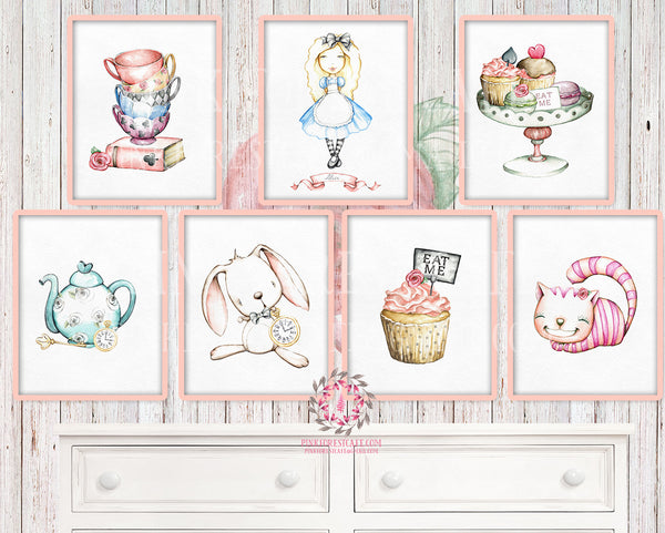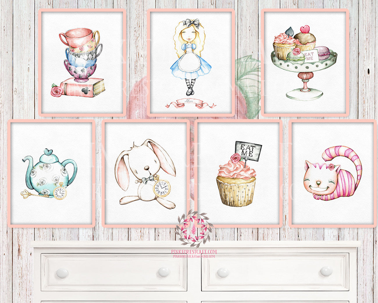7 Alice In Wonderland Wall Art Print Rabbit Cheshire Cat Boho Tea Party Nursery Baby Girl Watercolor Room Printable Décor by Pink Forest Café - Making your world a happier place, one wall at a time!