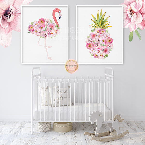 2 Pink Flamingo Pineapple Floral Wall Art Print Tropical Baby Girl Nursery Ethereal Whimsical Printable Decor by Pink Forest Café - Making your world a happier place, one wall at a time!