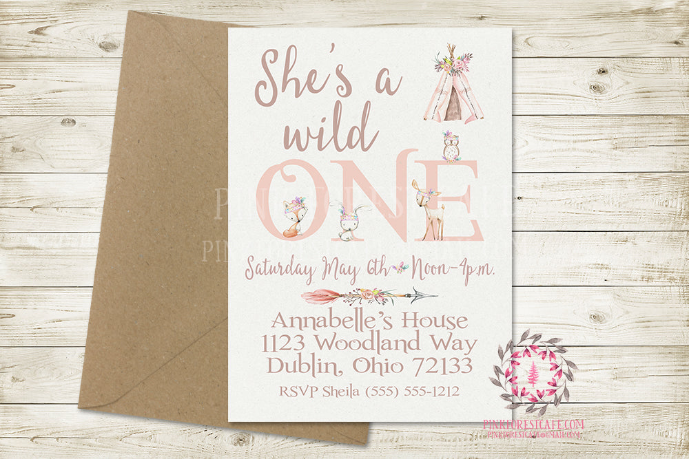 Woodland Boho 1st First Invite Invitation Baby Girl Birthday Party Wild One Tribal Feather Deer Bunny Fox Owl Watercolor Floral Printable