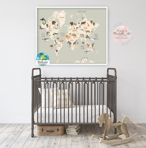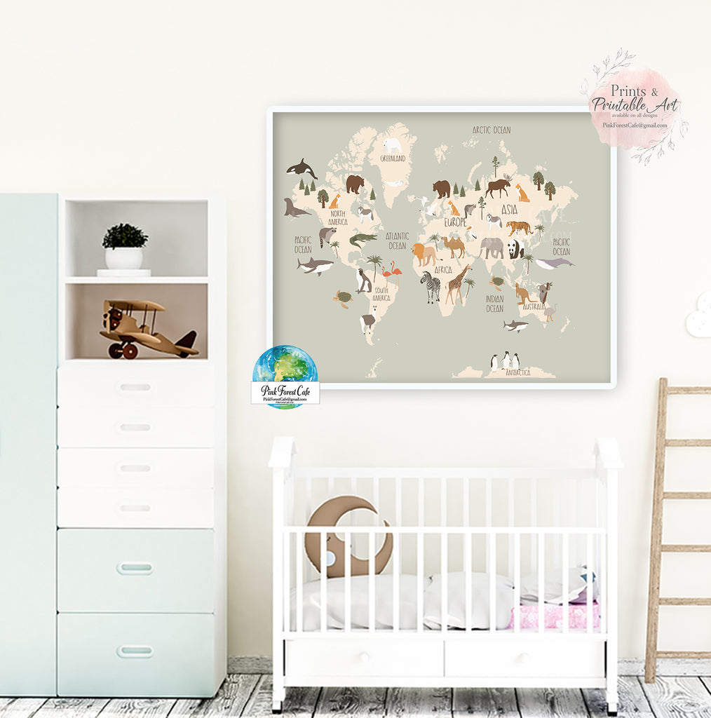 World Map Zoo Animal Wall Art Print Pink Baby Boy Nursery Room Printable Décor by Pink Forest Café - Making Your World A Happier Place, One Wall At A Time!